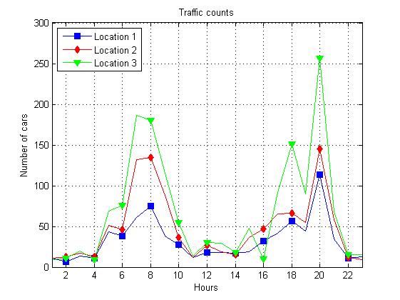Importujte count dataset (load count.dat), který představuje měření počtu vozidel na třech místech během 24 hodin. Vytvořte pomocí funkce subplot čtyři grafy (lineární, sloupcový, 3D sloupcový a histogram četností rozdělený na 5 intervalů). U lineárního grafu přidejte křivku pro průměrovanou hodnotu.